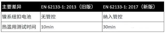其中,在鎳系電池部分,EN 62133-1:2017與原標準對比,兩者的差異體現在主要測試的更新,如熱濫用測試時間從10分鐘改為30分鐘。