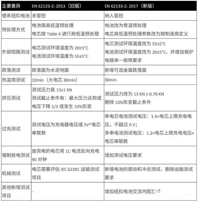為了進一步降低安全風險,歐洲電工標準化委員會于2017年5月12日發布了EN 62133-1: 2017和EN 62133-2: 2017兩個新標準(與IEC 62133-1: 2017和IEC 62133-2: 2017為等同標準),分別為用于便攜式產品中的可充電鎳系電池和可充電鋰系電池的安全標準,將取代原EN 62133: 2013標準(等同于IEC 62133: 2012)。EN 62133-1:2017和EN 62133-2: 2017將于2020年3月14日起在歐洲強制執行,舊版EN 62133: 2013標準將不被接受。