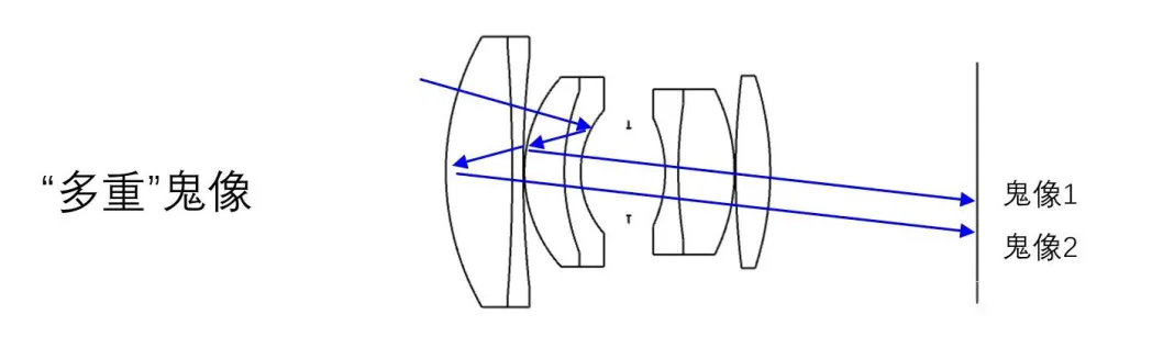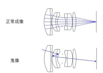 環(huán)境中存在的高亮度目標源在鏡頭內(nèi)部各個透鏡間快速反射,最終在圖像上形成的附加像,其亮度一般較暗,且與原像錯開。由于任何兩個鏡片表面都可能發(fā)生這種現(xiàn)象(應(yīng)該說都在發(fā)生,只是強度不同),兩兩組合可以產(chǎn)生很多光路,因此在這種情況下常常會形成一“串”光斑。