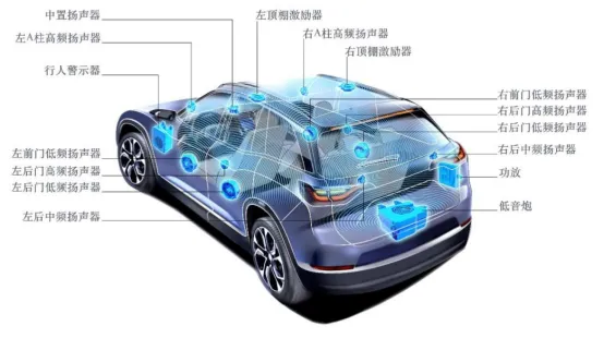 在汽車電動化后,車輛行駛的過程中由于缺少了發動機噪音使得車內環境更加安靜,駕駛者和乘客對車內聲場將會更為敏感,對揚聲器品質提出了更高的要求,因而新能源車廠更愿意在其車型上增加揚聲器數量,提升車內聲場品質。相對于傳統燃油車一般配置 4-8 個車載揚聲器(平均配備 6 個左右),2023年部分新勢力車企旗艦車型的揚聲器數量已達到20+個,新能源車型的揚聲器搭載量明顯高于傳統燃油車搭載量,高端新能源車傾向于配置更多揚聲器。