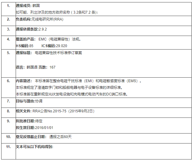 2015年9月14日,韓國無線電研究所(RRA)通過WTO發(fā)布公告,內(nèi)容關(guān)于修訂電磁兼容性技術(shù)標(biāo)準(zhǔn)的技術(shù)法規(guī)草案,通報(bào)號(hào)為G/TBT/N/KOR/602。