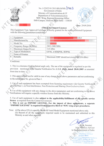 Specifically, any wireless transmission less than 3000 Ghz without manual control is considered "wireless communication" as defined by WPC. These frequency bands are under the control of WPC. That is, wireless transmissions (such as infrared) with frequencies higher than 3000 Ghz are not considered "wireless communications." WPC certification does not control these frequency bands. Since India has two types of free and unopened frequency bands, for wireless communication products whose frequency bands and output power fall within the control range, an ETA certificate must be applied to the WPC. In addition, ETA holders must be locally registered companies. In addition, WPC accepts the CE report's RF report to WPC certification, without the need to provide samples and tests.