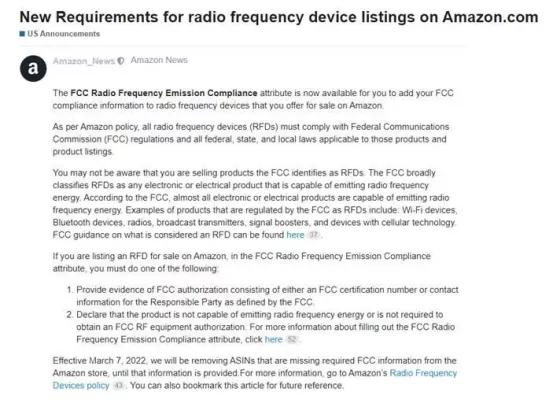 近日,亞馬遜又出新政策了,有關(guān)Amazon.com美國(guó)站銷售的射頻設(shè)備(RFD)必須滿足FCC合規(guī)新要求,強(qiáng)調(diào)了所有射頻設(shè)備(RFD)必須在2022年3月7日前提供FCC合規(guī)證明和信息,否則將會(huì)下架處理!