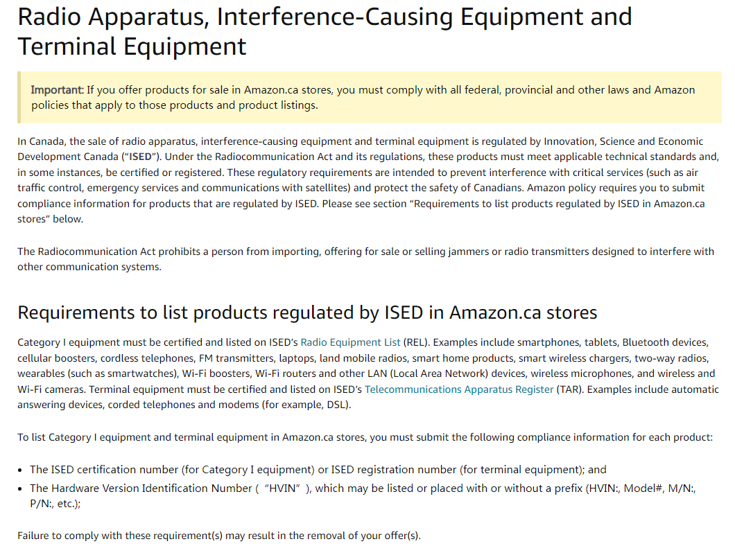 亞馬遜加拿大站最新政策:無線產品需在亞馬遜平臺提交合規信息,否則將有可能被下架。