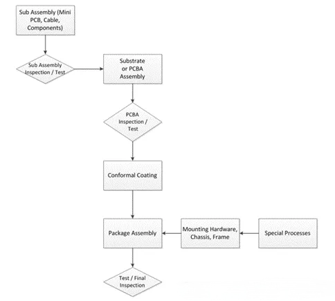 與AEC Q100類似,AEC Q104也對樣品的組裝批次提出了要求,同一組裝批次被定義為通過相同工藝步驟(即通過相同的機器使用相同的材料組合,直至完成MCM)組合在一起的MCM批次。組裝批次包括所有工藝和測試步驟。相同的材料組合包括多個可追蹤的子組件批次的組合。下圖展示了MCM生成的代表性流程。