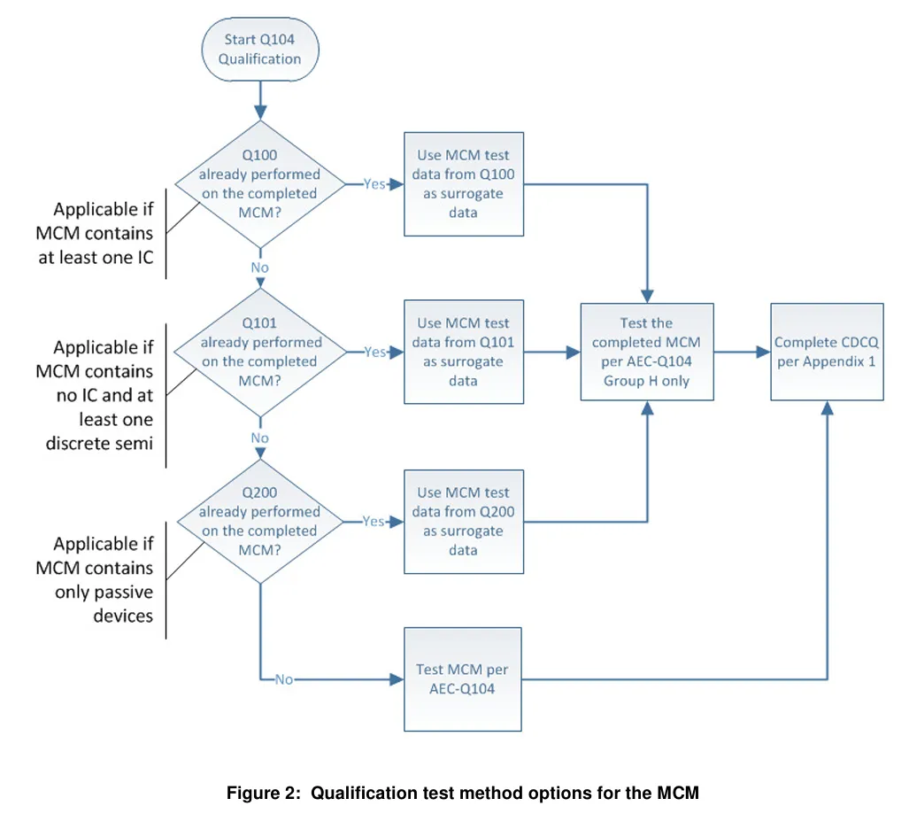 MCM/SIP是由多個芯片及器件組成的一個封裝,那這其中用到的芯片和器件還需要相應(yīng)的AEC-Q測試嗎?標準中也給了建議——可以使用MCM中相應(yīng)器件的AEC-Q100, AEC-Q101,或AEC-Q200認證原始數(shù)據(jù)去簡化AEC-Q104認證。
