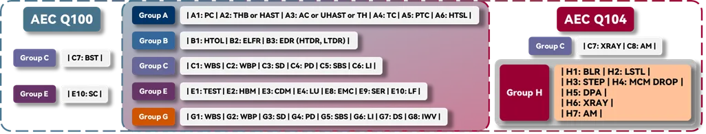 其中,H組測試是針對MCM的特定測試要求,也是AEC Q104和AEC Q100標準的最主要的區(qū)別,更細致的差別見下圖