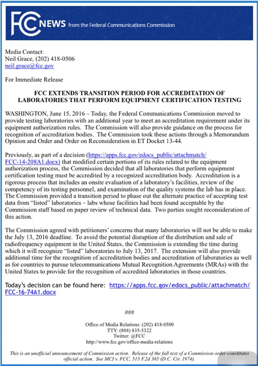 2014年12月30日FCC發(fā)布的Report and Order (FCC 14-208)中決定在無線通訊設(shè)備認(rèn)證中不再接受2.948列名實(shí)驗(yàn)室(2.948 Listed Lab)的測(cè)試結(jié)果,而要求無線通訊設(shè)備認(rèn)證的測(cè)試必須在取得FCC認(rèn)可的實(shí)驗(yàn)室(FCC Accredited Lab)進(jìn)行,當(dāng)時(shí)設(shè)定的過渡期是2016年7月13日。