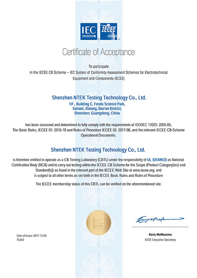 2017年12月5日,NTEK正式獲得國際電工委員會(huì)(IECEE)認(rèn)可,成為了目前少數(shù)擁有CBTL資質(zhì)的檢測(cè)認(rèn)證機(jī)構(gòu)。