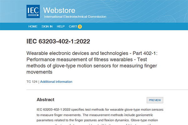 2022年11月4日,國際電工委員會(huì)(IEC)發(fā)布IEC 63203-402-1:2022《可穿戴電子設(shè)備和技術(shù)--第402-1部分:健身穿戴設(shè)備的性能測(cè)量--用于測(cè)量手指運(yùn)動(dòng)的手套式運(yùn)動(dòng)傳感器的測(cè)試方法》。
